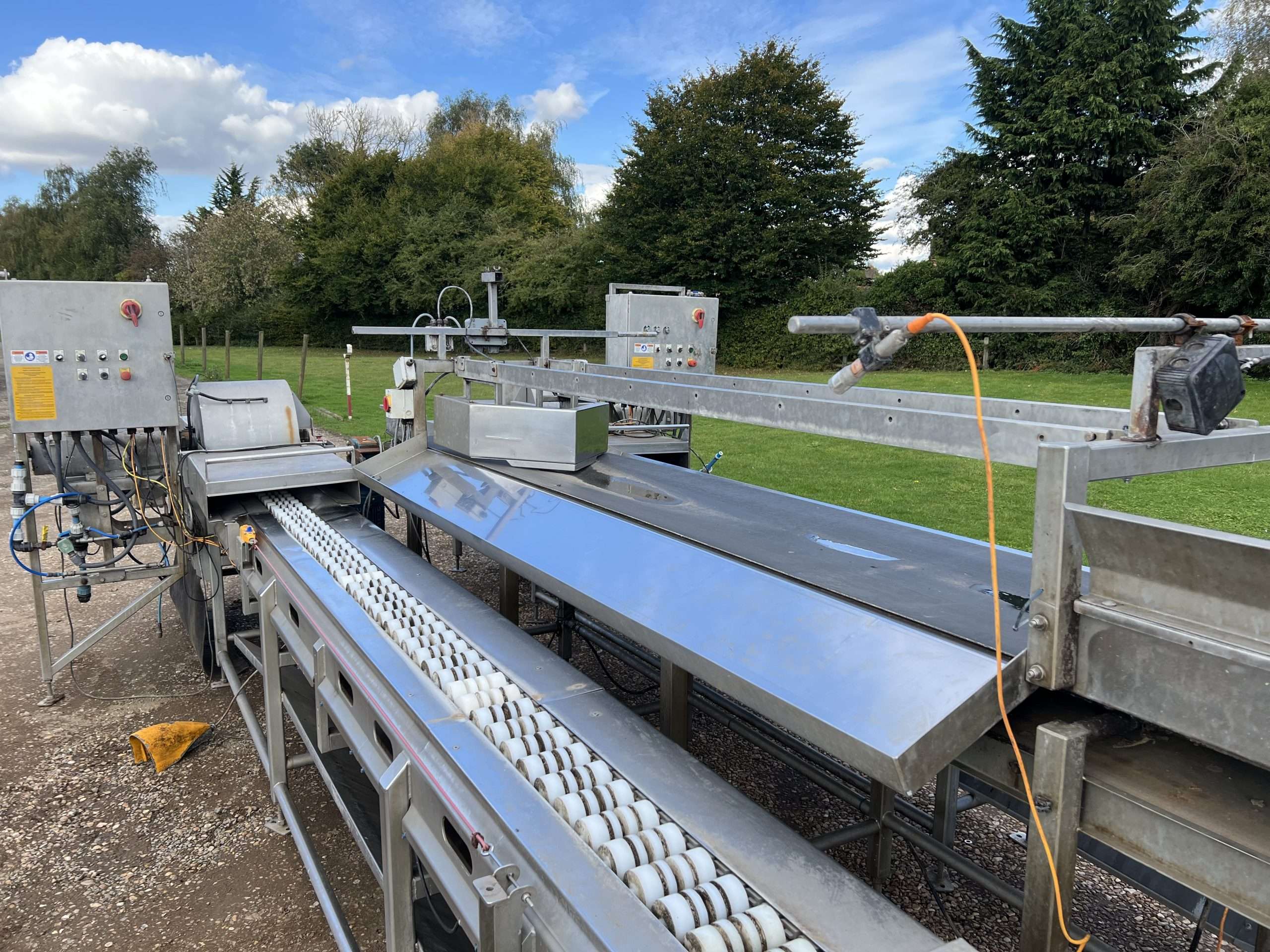 Used Hughes sweetcorn cutting line for sale. This line has a central conveyor to take the incoming sweetcorn on cobs and splits them across to both sides of the line. The sweet corn is then placed onto the representative cob saws to segment the cobs.